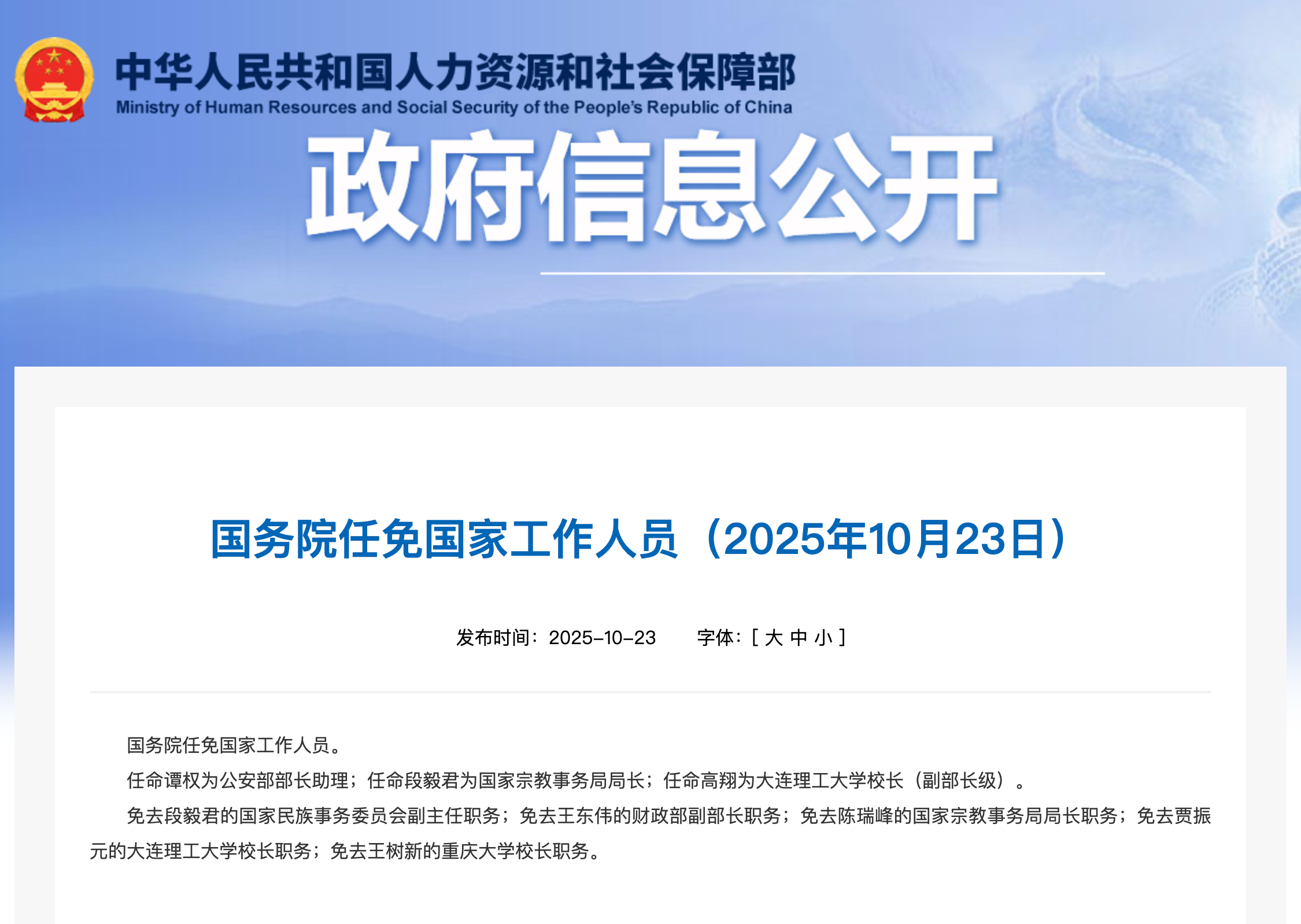 据人社部网站10月23日消息,国务院任免国家工作人员。